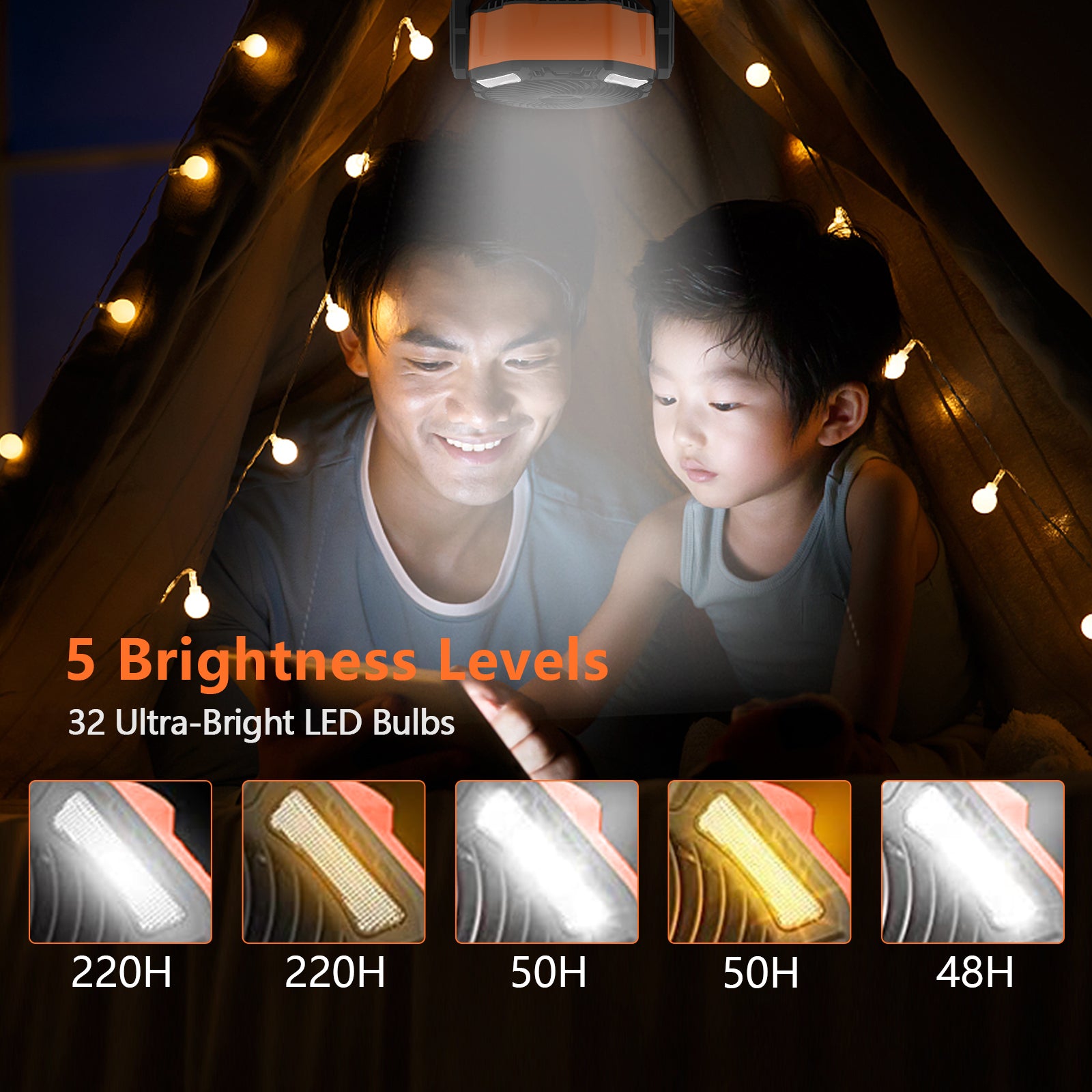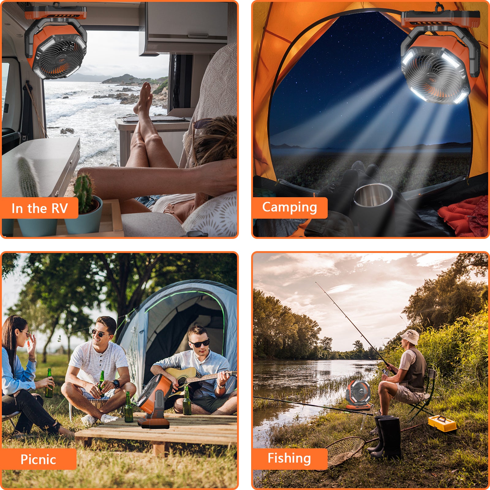 - 【5-Level Adjustable Lantern】Compared with portable fan for camping in the market, our tent fan for portable is composed of 32 ultra-bright LEDs wiht 5 brightness gears (included yellow and white light). It can work up to 220 hours after fully charged. It is an ideal light source for camping, barbecue, RV, picnic, hiking, fishing, outdoor activities etc.
