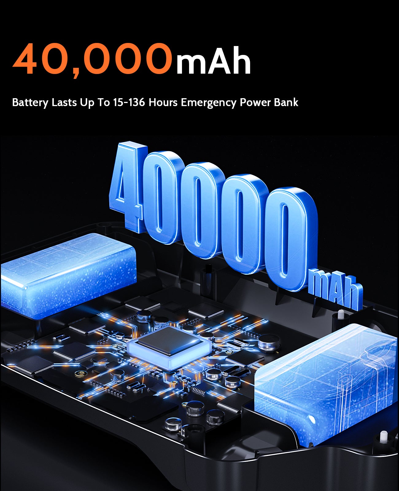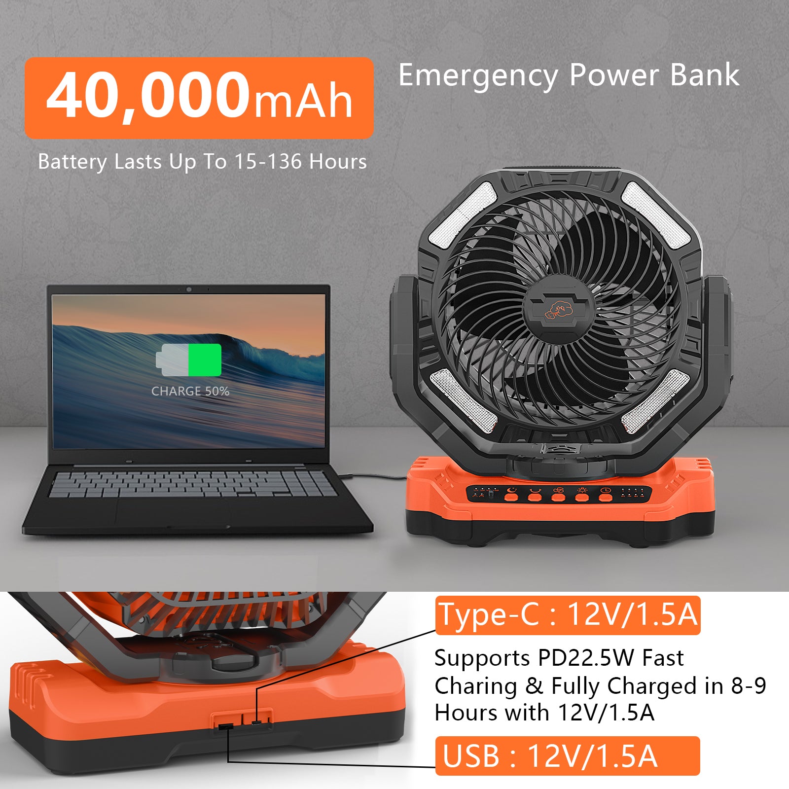 - 【40,000mAh Rechargeable Camping Fan】Battery operated fan, built-in in a 40,000mAh large-capacity rechargeable battery, can work continuously for 11-136 hours after fully charged in 9 hours via 12V1.5A type-c cable(included). Rechargeable fan can be used as a emergency power bank to charge your cell phone or laptop. It is perfect camping equipment.